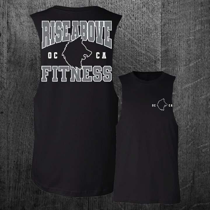 Unisex Premium Jersey Tee; "OC CA" Front Pocket Print; "RISE ABOVE FITNESS" Back Print